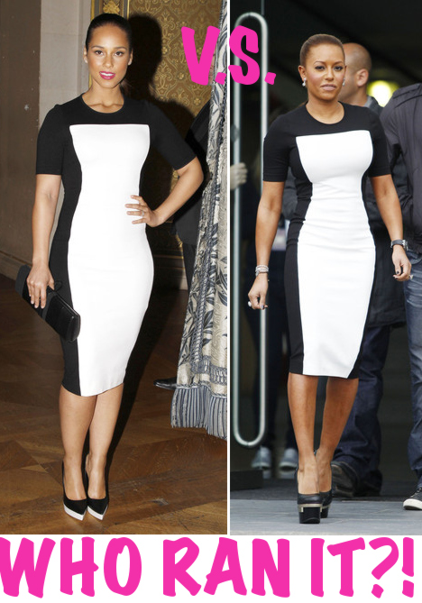 It's a color blocking FACE OFF! Singer Alicia Keys & Singer/TV Personality Mel B. both rocked the Stella McCartney's Fall 2012 black & white color blocked stretch jersey contour dress recently.